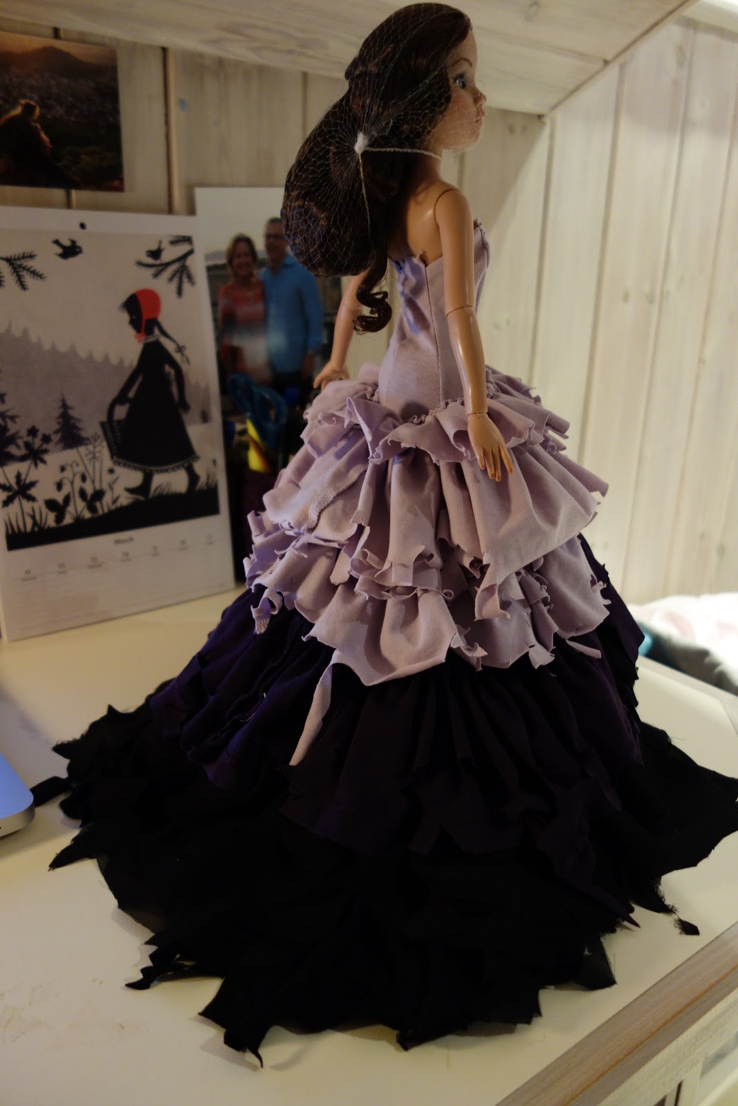 The light weight and volume of the gown came out beautifully, particularly the darker violent between the lilac and black layers making a smooth transition in the color palette. However the weight of the skirt was so heavy, I had therefor reconsider the sleeveless bodice idea. The ruffled halter top Mila Kunis wore for the cover of Sunday Times Style magazine inspired me to compromise the shredded gathered ruffles in the front to hide the halter additions, the ruffles merging at the waist line with the rest of the skirt! The effect is much more editorial than my original design.